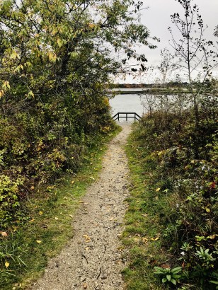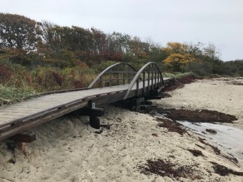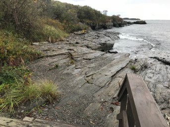 No rain as soon as I crossed the Maine state line and in fact the whole afternoon. The cove is simply a beach with lots of sand, darkened by the foaming waves. The only sounds I heard were the water crashing against broken but smooth rocks and the distant signal from what I believe to be the lighthouse a few miles further down. Draped over the beach were red seaweed, shells, and my footprints. Merged with the sidewalk by the parking area was a little crescent-framed bridge. Ten yards later was a wooden platform balcony adjacent to a pathway which led to multiple park trails. Finally, in the center of Kettle Cove, two patches of grassy land framed a small shore where a boat